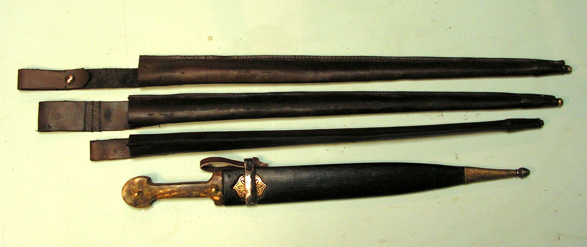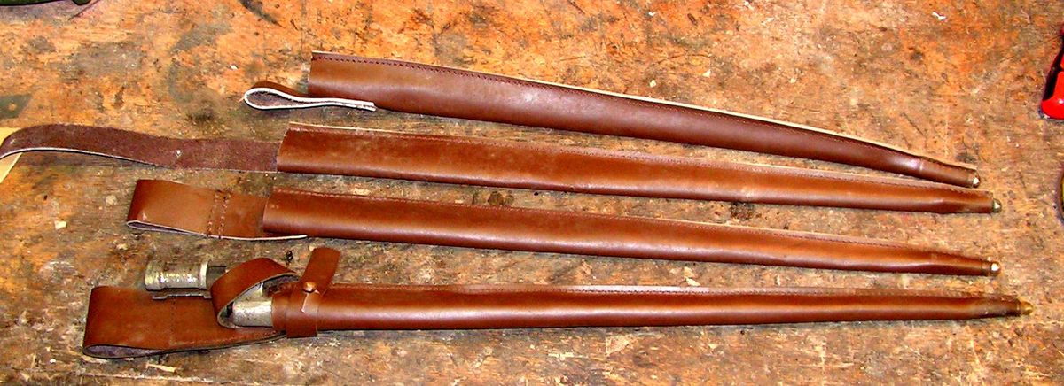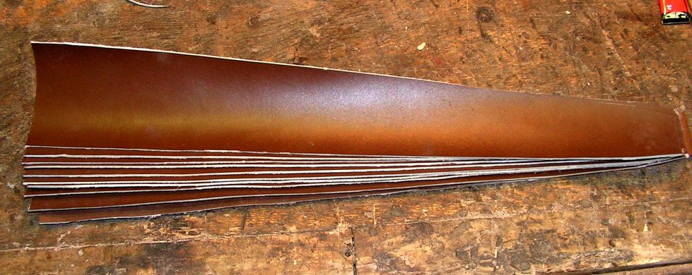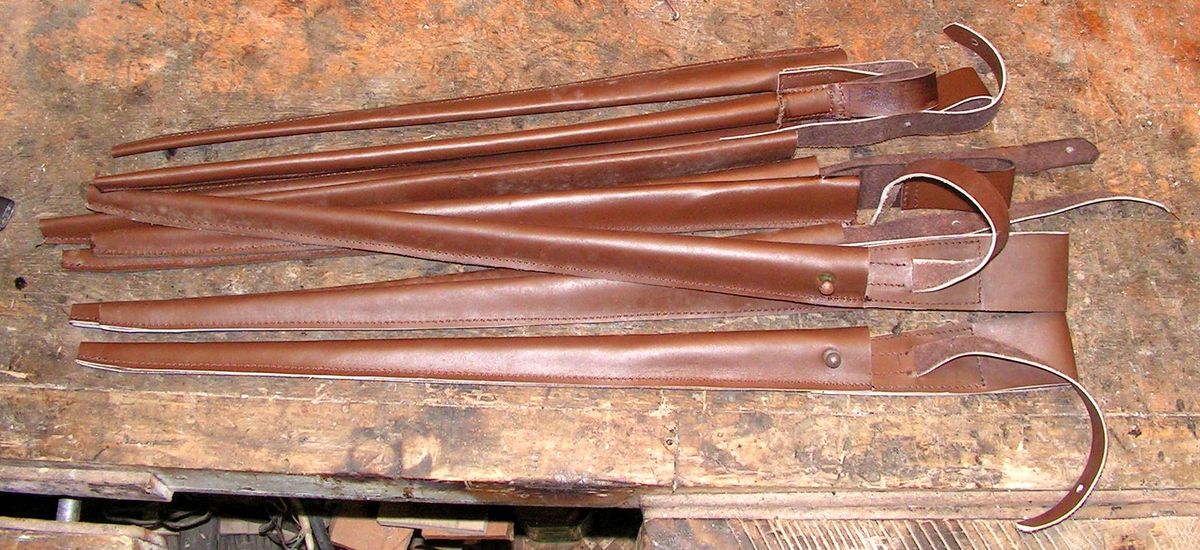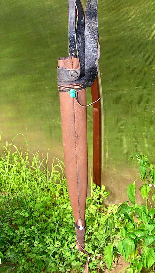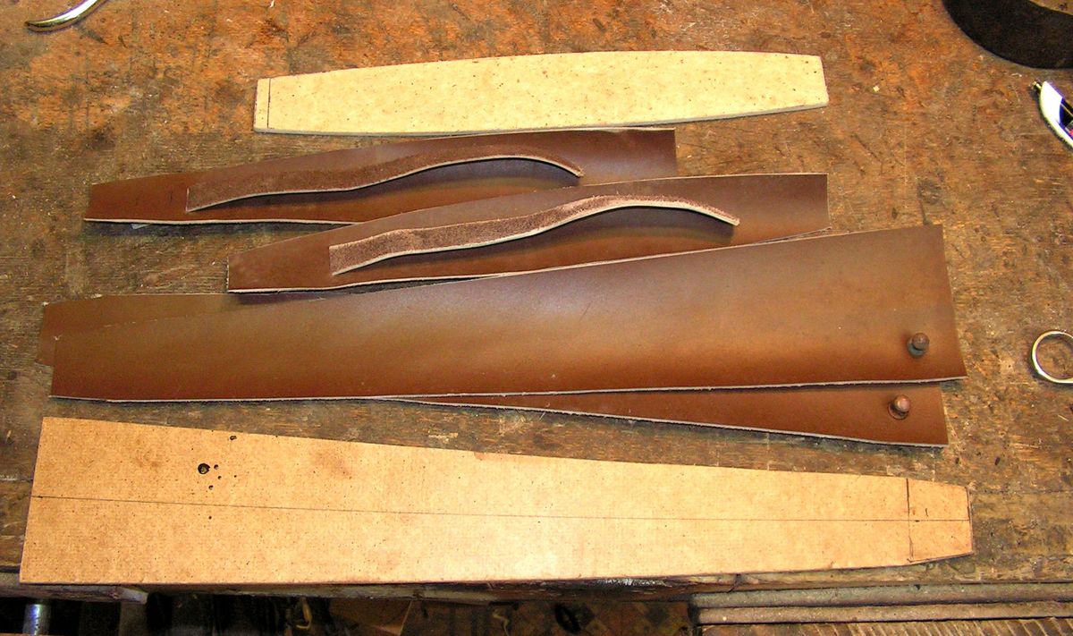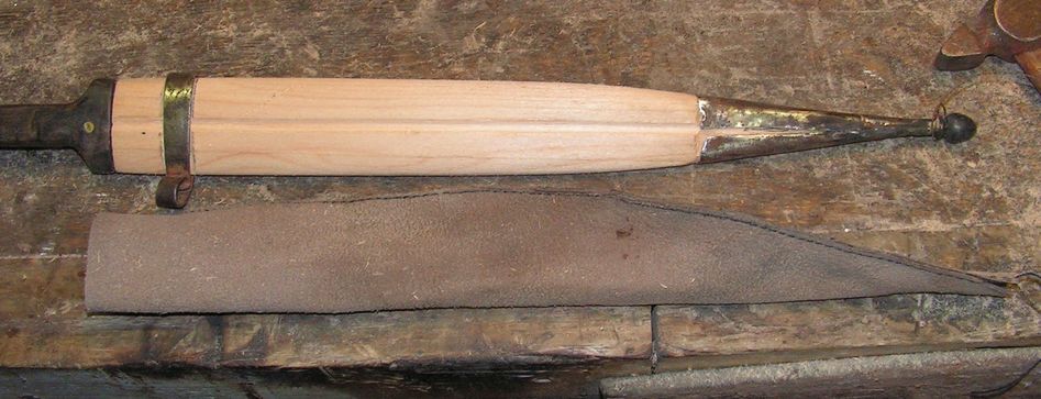 На предыдущих фото видно, что и под стакан, и под бляшку, и под гайку и под шов сделаны выборки в древесине. Сначала хотел обтянуть ножны козлятиной, но в связи с тем, что они получились очень и очень тоненькие а фурнитура садилась на них плотненько, очень, то обтянул их бараньей кожей коричневого цвета, под покраску.