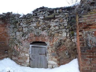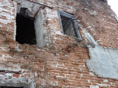 Церковь походу в войну так разрушили , видны отметены пуль и решетка наружу, как взрывом изнутри вырвана.
