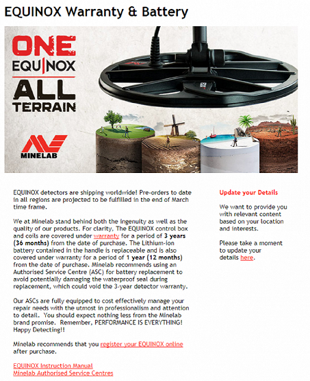 QUOTE(PUHH @ Feb 27 2018, 05:27) А можно фотку условий гарантии? На сайте минелаба в разделе гарантия есть информация такая: "... EQUINOX Series detectors, Minelab branded search coils, handles, shafts, headphones... are under warranty for a period of 3 years (36 months) from the Date of Purchase." - прибор, фирменная катушка, ручка, штанги и наушники на гарантии в течение трёх лет с момента покупки. Про АКБ и год гарантии было доп письмо от минелаба, фото я выкладывал... Про год гарантии на катушку это 100% отсебятина мдр. Кстати на самом сайте минелаб.орг есть пункт про регистрацию своих эквиноксов по серийным номерам на этом сайте, и вот я уверен что если зарегистрировать там по серийнику прибор то в случае отказа например через 2 года катушки (без само собой нарушения со стороны пользователя гарантийных условий) минелабы кокушки открутят мдр если те окажутся выполнить гарантийную замену или ремонт. Нужно просто немного знать и уметь пользоваться информацией. |