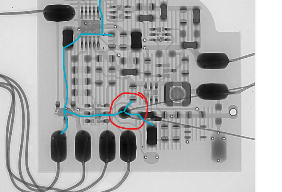И так, сделал я рентген катушки Эквика и магнитной зарядки, попробую по порядку... Фото 1. Сама схема в катушке, микросхемы, резисторы, конденсаторы, диоды, катушечка одна виднеется, сборка очевидно аппаратная(не вручную элементы паяли) в общем, ничего вроде необычного... ![]() Фото 2. Схема в катушке чуть подальше, с захватом входа провода в катушку снаружи... Тут вот на тонкой обмотке увидел интересную штуку, назовем её некой "антеннкой". Буквами и стрелочками обозначил то, как по моему мнению эти проводники(антеннки) выходят и где каждая заканчивается. Тоесть каждая делает почти один оборот по тонкой обмотке в противоположную сторону друг от друга... Это только мое мнение. ![]() Фото 3. На толстой обмотке эта "антеннка" так же имеется, но более интересной формы. Фото слепил из трех частей, так как более крупное фото(снимок) сделать не удается. Если эти "антеннки" давно всем известны, то сильно не пинайте, я детекторы не разбирал никогда, и схемотехнику их особо не изучал, по этому даже не знал что там такое может быть. Сначала подумал какие-то рваные провода ![]() Фото 4. Разъем катушки. Ничего особенного, пару более толстых проводов на питание катушки, остальные сигнальные. ![]() Фото 5. Магнитная зарядка. Как видно никаких микросхем не прослеживается, 2 толстых провода питания(зарядки) и 2 тонких провода шины данных, ну и экран соответственно. Пайки у проводов конечно не ахти, но, Малайзия, что тут сделаешь, штампуют ![]() Фото 6. Вот тут они конечно прикольно сделали, питание и шину данных крест накрест... Я если честно представлял что будет, скажем так, построчно в ряд например. Очевидно распиновка у контактов вот такая... ![]() Вот вроде и все... Спасибо за внимание Если что, могу сделать снимки разных ракурсов... но тут вроде и так все очевидно Кстати, интересно было бы взглянуть на реальные поломки, которые происходили у людей, типа "отвалившейся кнопки внутри", думаю на рентгене будет хорошо видно каким образом там она отвалилась, в местах пайки или в других... -------------------- Чтобы избегать ошибок, надо набираться опыта, чтобы набираться опыта, надо делать ошибки...