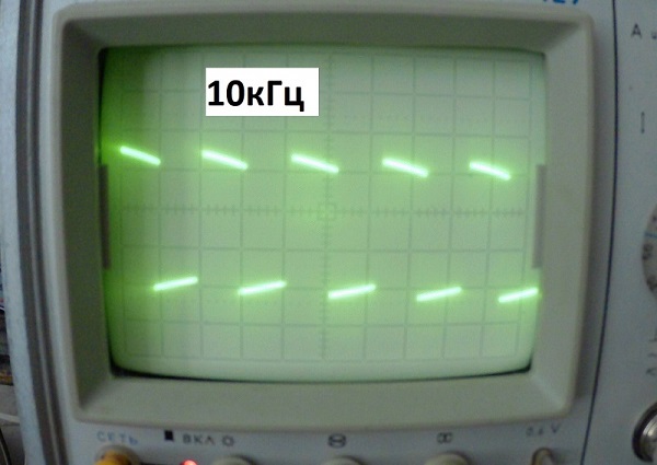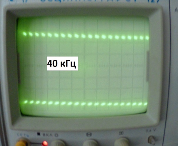 Частота равняется 1/Т(период). На этом осциллографе нет букв на экране, поэтому вот так. |