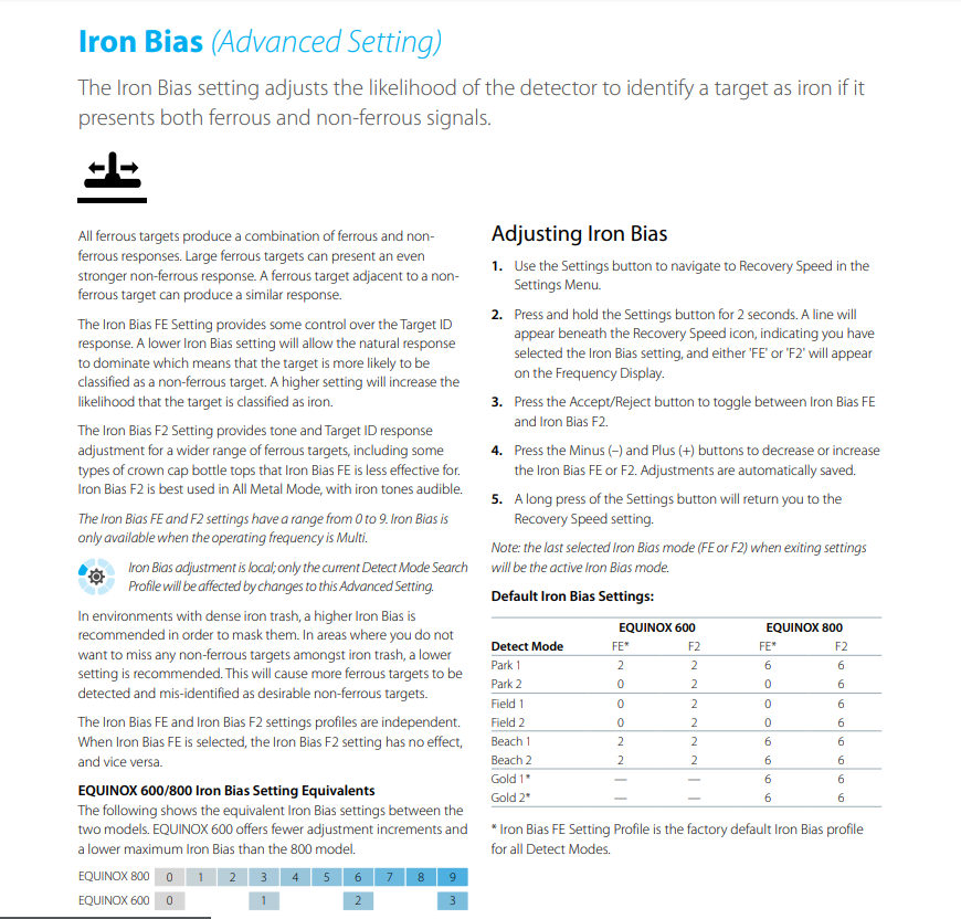 Всем привет! Какое-то время я помогал разрабатывать и испытывать последнее обновление для Эквинокса и могу сказать, что мы получили отличное сочетание настройки iron bias FE и новой настройки Fe2. Теперь пользователям намного проще определить железо и пивные пробки, если они работают с новой прошивкой. Я испытывал прибор во множестве мест, сотни часов поиска и в парках, и в лесах, и на пешеходных тропах, и по стерне, и по пашне, и по посевам, песчаным речным берегам, и тд, и тд. и прошивка становилась всё лучше. Для тех, кто ищет в парках, лесах и на пляжах пивные пробки остались в прошлом (почти), я говорю «почти» потому, что всегда найдется та самая, подленькая пробка, которая прорвется, не так ли. Однако я не выкопал ни одной и с теми сигналами, которые выдавали пробки я был на 100% уверен, что они именно то, что показывает прибор и не сомневался, что их копать не надо. Если вы ищете, скажем, в парке и начинаете натыкаться на пивные пробки, используя обычные настройки, то войдите в ваш АБ режим, нажмите кнопку «Принять/Отклонить», которая вызовет новый режим F2, и установите значение 4, и вы сразу услышите разницу, а также увидите разницу в ВДИ. Чем выше значение настройки F2, тем точнее определяется железо и пивные пробки. Сигнал от пробок начнет распадаться, становиться размытым, значения ВДИ начнут прыгать вверх и вниз в минусовую зону. Чем выше уровень F2, тем это становится очевиднее. А самое крутое, что при этом прибор продолжает видеть мельчайшие и тончайшие предметы. Некоторые предметы, которые я использовал в тестах были сложными для идентификации любым прибором с любым видом дискриминации. Даже используя F2 со значением 4 и до 9-ти, на полную, чтоб не копать пробки и тд, прибор все ещё с легкостью определял маленькую серебряную сережку в виде полого кольца, также видел ее в разомкнутом состоянии, это важная способность для всего маленького круглого и не замкнутого. Другая теставая цель, которую я использовал, это - крохотный кусочек высокопробного золота, известный как «мУшиный помет» и даже это было увидено - блестящий результат для такой маленькой цели. В режиме F2 железо легче определить, даже при таком низком значении, как «1». До обновления я всегда находил слишком рискованным не копать сигналы пивных пробок, поскольку определенные цели могли давать такой же сигнал, в зависимости от толщины, изогнутости, расположения в земле или близости к железу. Этот апгрейд значительно упростит работу с Эквиноксом для многих людей, особенно для тех, кто испытывал трудности с сигналами железа. Теперь им будет гораздо проще. Есть другой сюрприз, который я думаю, обнаружил, но отложу, пока не буду уверен. А пока наслаждайтесь. Сноска......... гораздо лучше использовать F2 на всех металлах, а тона железа лучше помогают с ID в любом случае -------------------- Things must change…