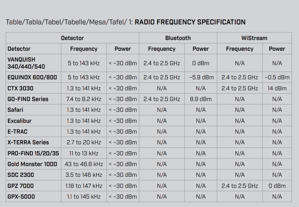 QUOTE(Шатунов @ May 6 2021, 22:48) Сограждане, сегодня видел инструкцию ЖПХ 6000, а там зачем-то прописаны и другие приборы, точнее, частоты на которых они работают. Так вот, по нашему; Radio Freguency Specification EQUINOX 600/800 - Freguency 3.7 to 143 kHz Блин, это только я впервые вижу частоты Эква от производителя или они и правдв первый раз их озвучили? Эта информация есть на оф.сайте, я ещё год назад выкладывал: https://www.reviewdetector.ru/index.php?sho...20&p=21708266 Это как бы результаты тестов на безопасность, какой прибор что излучает... Не выжигает ли мозг у кротов например Но на оф.сайте они ещё не поправили табличку Там же можно найти и тесты АКБ (с указанием производителя, фотками, результатами тестов): https://www.minelab.com/russia/compliance |