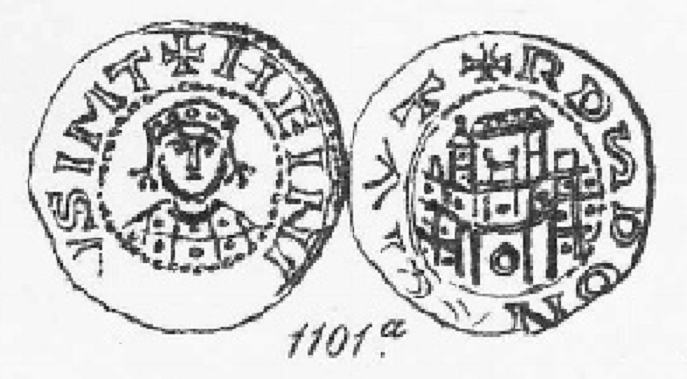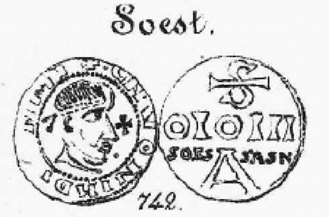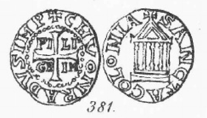 12) Пфенниг с Кёльнской монограммой, на монете при увеличении видна "S" ( Sancta) Целиком монограмма S-COLONIA-A (Sancta Colonia Agrippina) |