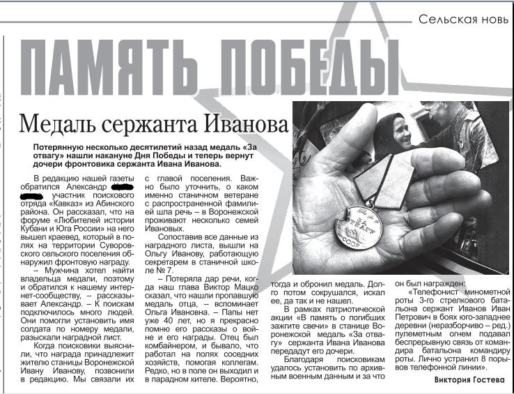 QUOTE(Юрий.Ж @ Oct 26 2017, 21:28) Доброго! По весне нашёл Отвагу в заброшенной деревушке.По номеру награждение в 1944-5 году.Найдена в Курской обл.Номер 1981892 . С уважением,Юрий. QUOTE(AlexMS @ Oct 26 2017, 22:45) Всем здравствуйте. В прошлом году была найдена медаль За отвагу под номером 9913. Попытка пробивки через наши местные поисковые отряды ничего не дала. Буду рад помощи в определении награжденного для дальнейшего поиска его родственников. Следите за темой. Если МО то установим героев. -------------------- Нет лучше в мире педагога, чем наша собственная жизнь...