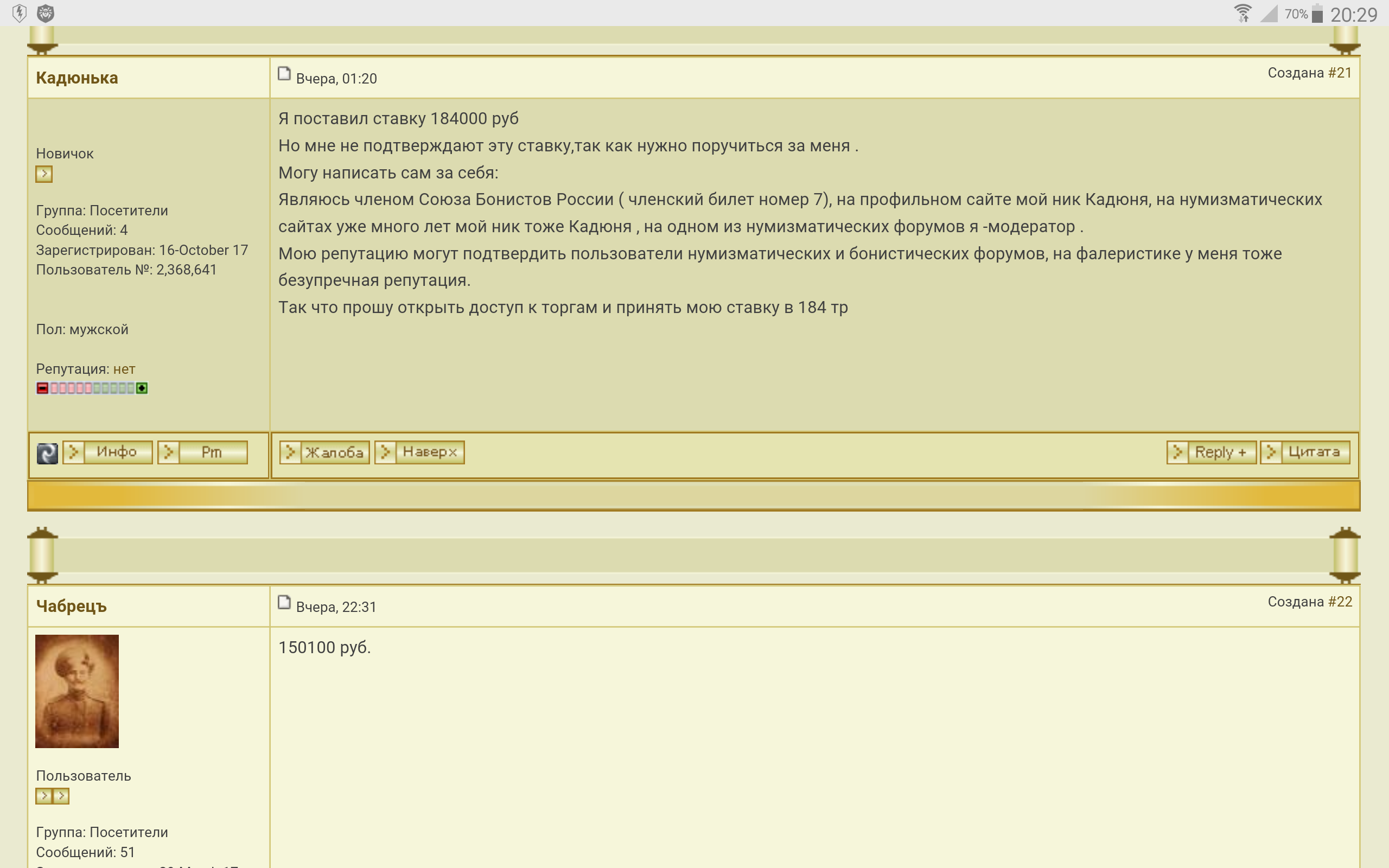 Добрый вечер . Когда вы перебили мою ставку 150 т . Мне хозяин знака написал в личку,что лидирует моя ставка 150 т .Если с форумчан будет поручитель за вас то будит лидировать ставка 184 т . Скор до пятницы . И больше не кокой инфо от , хозяина лота . С увж . Сергей .