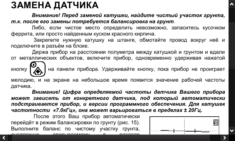 В случаях значительного перепада температур (больше 15°С, относительно нормальных +20°С) мы рекомендуем произвести заново процедуру адаптации электронного блока к датчику (катушке) (см. раздел «Замена датчика»). В этом случае процессор вашего детектора заново выберет оптимальную частоту тока возбуждения для данных температурных условий. При этом будут гарантированно сохранены все основные показатели назначения прибора, включая ток потребления. QUOTE(дмитрий А @ Jun 19 2012, 21:58) Наверно,но в инструкции об этих 2 функциях я ни чего не нашел Нда... Инструкция ещё по старому... -------------------- Hoc est vivere bis, vita posse priore frui
