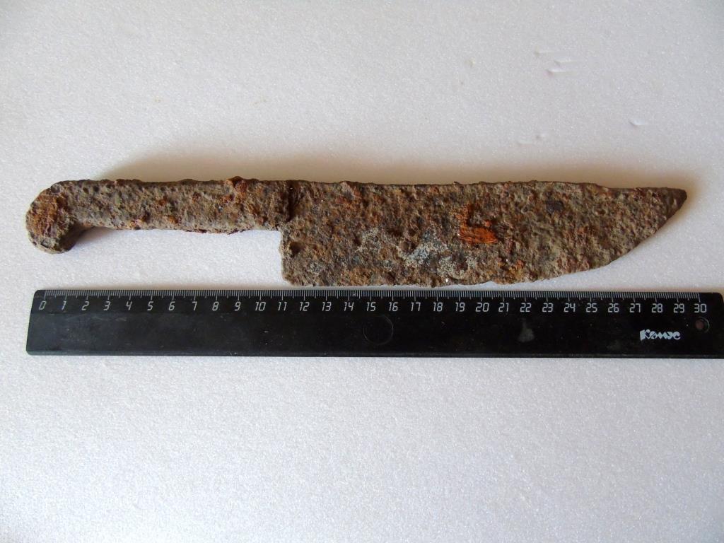 QUOTE(Ostahevo @ Apr 12 2016, 15:55) Первый раз попробовал ГП. Рядом с фундаментом дома...на месте бывшего сарая. Сначала проверил в обычном режиме....кругом чернина...цвет не обнаружил. В ГП фильтр Т сразу выставил 22. Катушка 13" 3Ф частота 3 Кгц. Уверенно показывает кругом черное....ловлю цвет...кручусь вокруг....звук в цвет...годограф вправо...ВДИ...в районе 70. Копаю....примерно с двух штыков....вот такой кованный тесак. Думаю что первое знакомство с ГП....прошло неплохо QUOTE(Петрович @ Apr 12 2016, 17:18) Если б он лежал неглубоко, то сигнал был бы чисто железный. А так то поздравляю, подход правильный. Фильтром Т можно регулировать свою жабу. Т=22 - это дл я максимально крупных предметов.Кубыха тестовая с Поведников нормально ловится при Т =15. Но есть шанс потерять нечто менее крупное, на 500 грамм например..При Т=15 такой предмет видится, выше не задирал, Пока четкой статистики по двум фильтрам нет - буду ходить на штатных настройках Т и А. Тем более что при Т >15 есть шанс пропустить цель некрупную под слоем ММ. Сообщение отредактировано пЫночет: Apr 12 2016, 20:13 -------------------- Землю - крестьянам