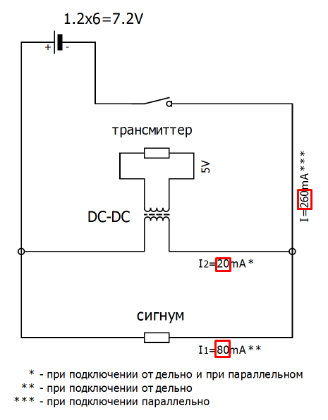 Вопрос задавал, но никто так и не ответил, может сейчас Захотел запитать от штатного питания Сигнума параллельно трансмиттер через преобразователь напряжения DC-DC 5V, для подключения беспроводных ушей, чтобы не колхозить внешний источник питания и трансмиттер спрятать в блок. Заколхозил, аккумуляторы стали уходить за 6-7 часов против часов 25 при нормальном использовании. Померил ток, катушка потребляет 80мАч, трансмиттер + DC-DC: 20мАч, а все вместе, при параллельном подключении потребляет 260мАч. Отчего вместо положенных по науке 20+80=100мАч потребление вырастает в 3 раза? Что делаю не так? Вложенные эскизы изображений |