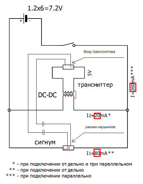 Схему, что выложил "sledopblt" я перерисовал, как сделано у меня. Обратите внимание на то, что я сигнал беру только с одного выхода на наушники и с общего провода прибора, а у Вас и в схеме "sledopblt"а один из двух выходов на наушники замыкается с общим проводом трансмиттера, который в свою очередь соединен с общим проводом прибора. Получается короткое замыкание одного из выходов мостового УНЧ и прибор жрет бешеный ток. То же самое получиться если использовать моно-разъем.