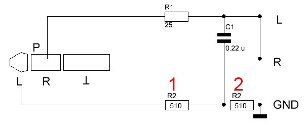 QUOTE(sss @ Nov 15 2017, 17:15) По схеме Следопыта всё должно работать, если подключать через разъём наушников. Т.к. выход на наушники содержит последовательный резистор 510 Ом (стоит рядом с разъёмом на плате). Получается, что сигнал одного плеча ( R) идёт на соединённые входы трансмиттера через 25 омный резистор, а к земяеному (L) через 510 Ом. Если не напутать подключение R и L всё заработает! С конденсатором 0.22мкФ можно перестараться, если увеличивать его ёмкость - звук будет более глухой... Попробуйте подключить внутри с учётом вышесказанного. Строго надо к L земля, а к R - трансмиттерные L и R, или можно наоборот? И резистор R2 (510 Ом) в позицию 1 или 2? (правая сторона картинки - трансмиттер) Сообщение отредактировано RGF: Nov 15 2017, 22:24 |