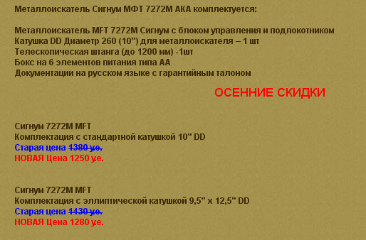 QUOTE Всем здравствуйте! Всю зиму только читал, а сегодня решил написать и поделиться с вами своей радостью. Сегодня купил сигнум !!! В связи с этим вопрос - подскажите кто разбирается... В комплектации прибора не стандартная катушка, а эллипс 9.5 на12.5 7 КГц.Это лучше или хуже ? Я сам такую заказывал, а вам что, всучили ненароком? ))) Сообщение отредактировано Saranskii: Mar 16 2012, 22:29 -------------------- Меня как копаря раздражают две категории людей - алкоголики и гармонисты.