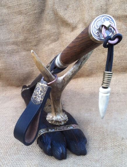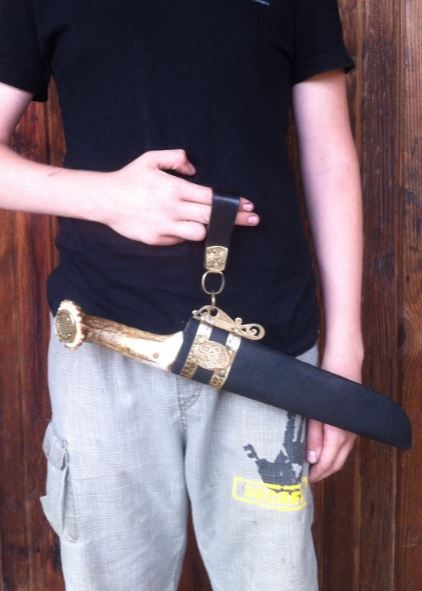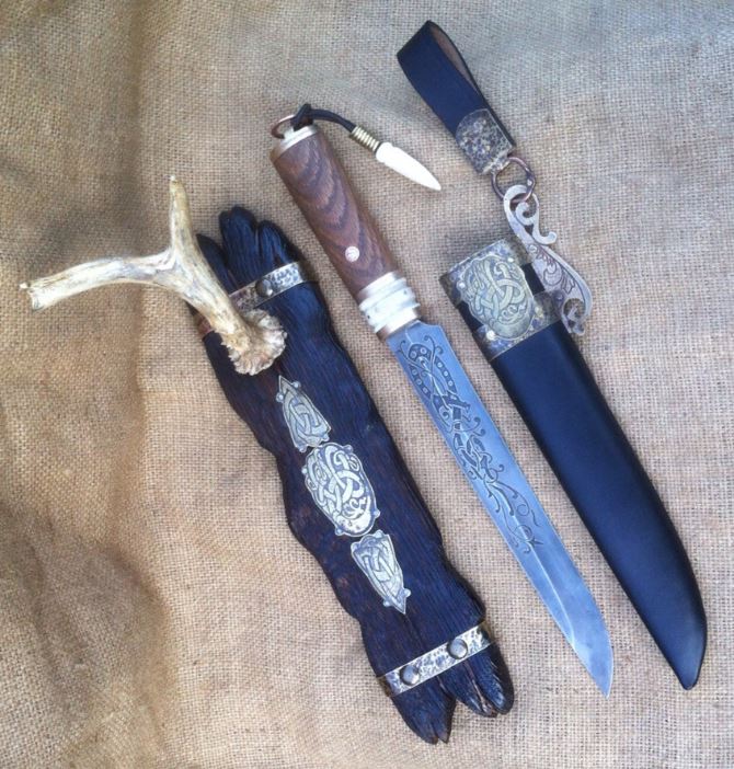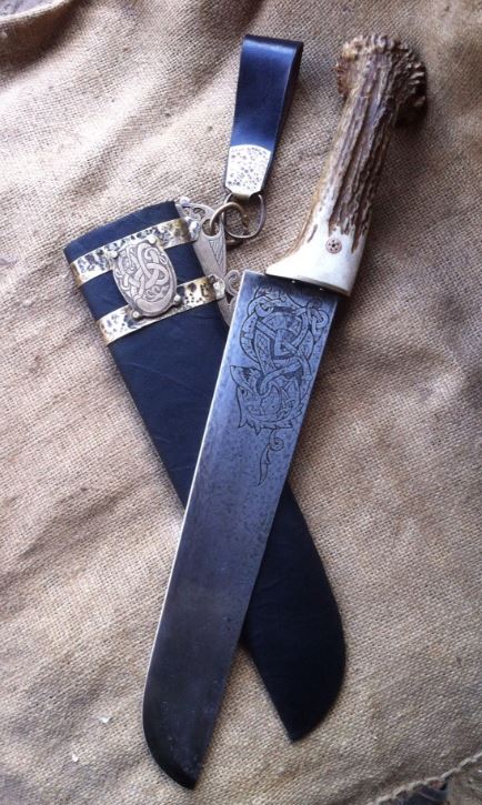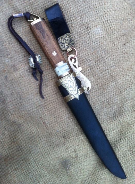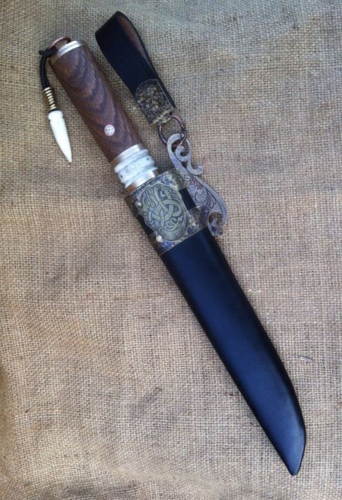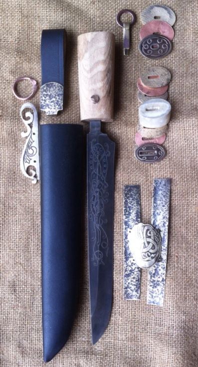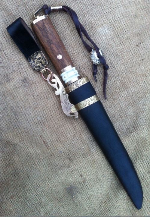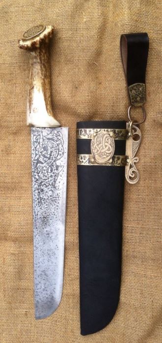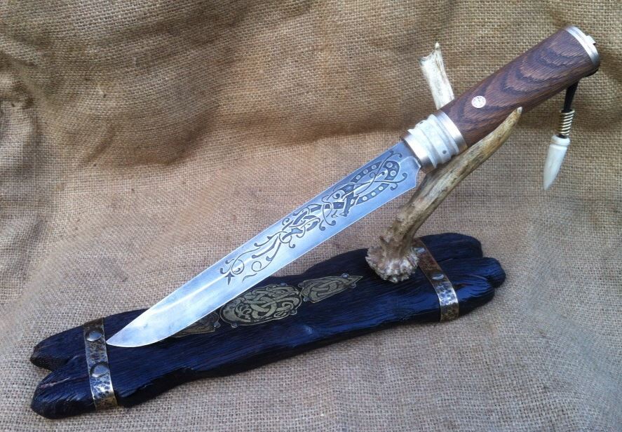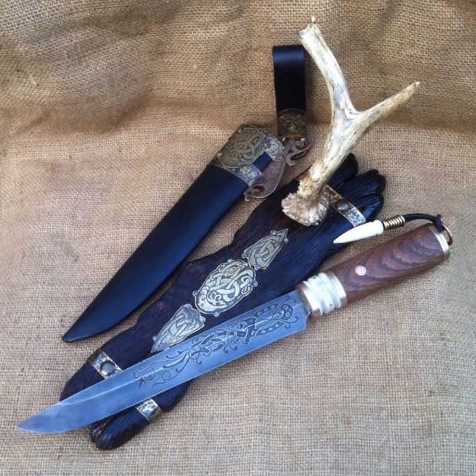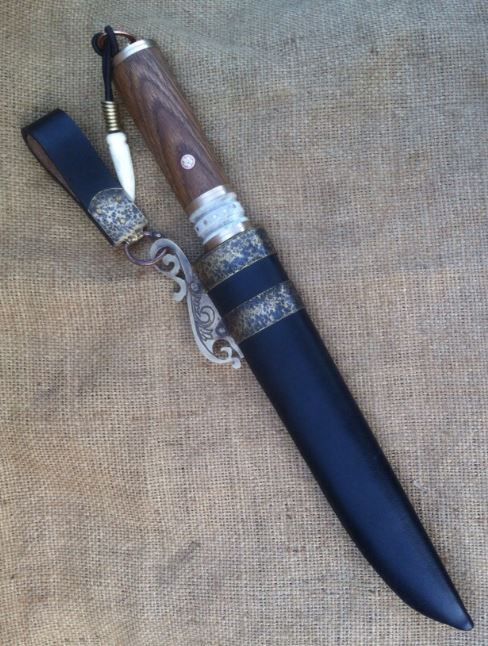 Без обид, но сами посудите и увидьте: - ручки ножей из корявого рога ни коим образом не удобны в быту, ни в руки взять, не помыть. Кинул в мойку с остальными - рано или поздно порвёт трещиной. Садить прямой клинок на кривую ручку и аппелировать к немцам - но в любом обществе и стране существовала и безвкусица и любой мало мальски знакомый с принципами гармонии или сопряжений скажет, что прямое и имеющее обозначенные границы на коротком промежутке не может стыковаться с гнутым. А гладкое с корявым. По меньшей мере нужен некий переход Ну и ещё, по дереву. Здесь по формам всё вроде логично, НО - ручки из "топорного" дерева на ножах, да ещё расписных по клинку, и смотрятся несколько топорно. Ибо если от клина недешёвого ты повёл кружева, то уж будь добр сделать и гармоничный переход на рукоять. И она не должна быть такой, как на дешёвых китайских ножах на базаре. Ну а по плетению - что тут непонятно? Предположу, что деревяшку обернуди лоскутом кожи с дырДочками и "прошили". Ну а кончик шнурка кожаного подсунуди отвёрткой внутрь. Если кожа сырая, то, высохнув, всё это село натуго. Досушить, покрыть - пропитать той же льнянкой- и на солнышко, высохнет - будет практически монолит. Пользы и практического применения от этого куска кожи, вероятно и нет, и в работе по любому истреплется, но "колеру" добавляет, безусловно. Надеюсь, мастера не обидел и он поразмышляет над моими замечаниями |