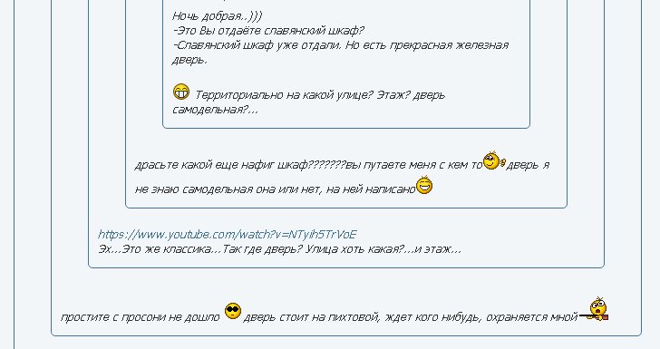 QUOTE(НикК @ Feb 2 2019, 01:23) пароль надо придумать. только не "Здесь продается славянский шкаф?" - уже занято. Вспомнилось. Как-то на местном сайте девушка отдавала дверь. В переписке припомнил про славянский шкаф. Она не сразу поняла эту классическую фразу..))) https://www.youtube.com/watch?v=NTyih5TrVoE Вложенные эскизы изображений -------------------- Копая там, где ты копал, вопрос простой, -а ты там клал?