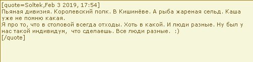 QUOTE(Soltek @ Feb 3 2019, 17:54) Пьяная дивизия. Королевский полк. В Кишинёве. А рыба жговненая сельд. Каша уже не помню какая. Я про то, что в столовой всегда отходы. Хоть в какой. И люди разные. Ну был у нас такой индивидум, что сделаешь. Все люди разные. Ну жговненая так жговнёная- хотя писал как "жа реная". Автозамена на совести форума... Сообщение отредактировано Soltek: Feb 3 2019, 17:58 Вложенные эскизы изображений -------------------- Копая там, где ты копал, вопрос простой, -а ты там клал?