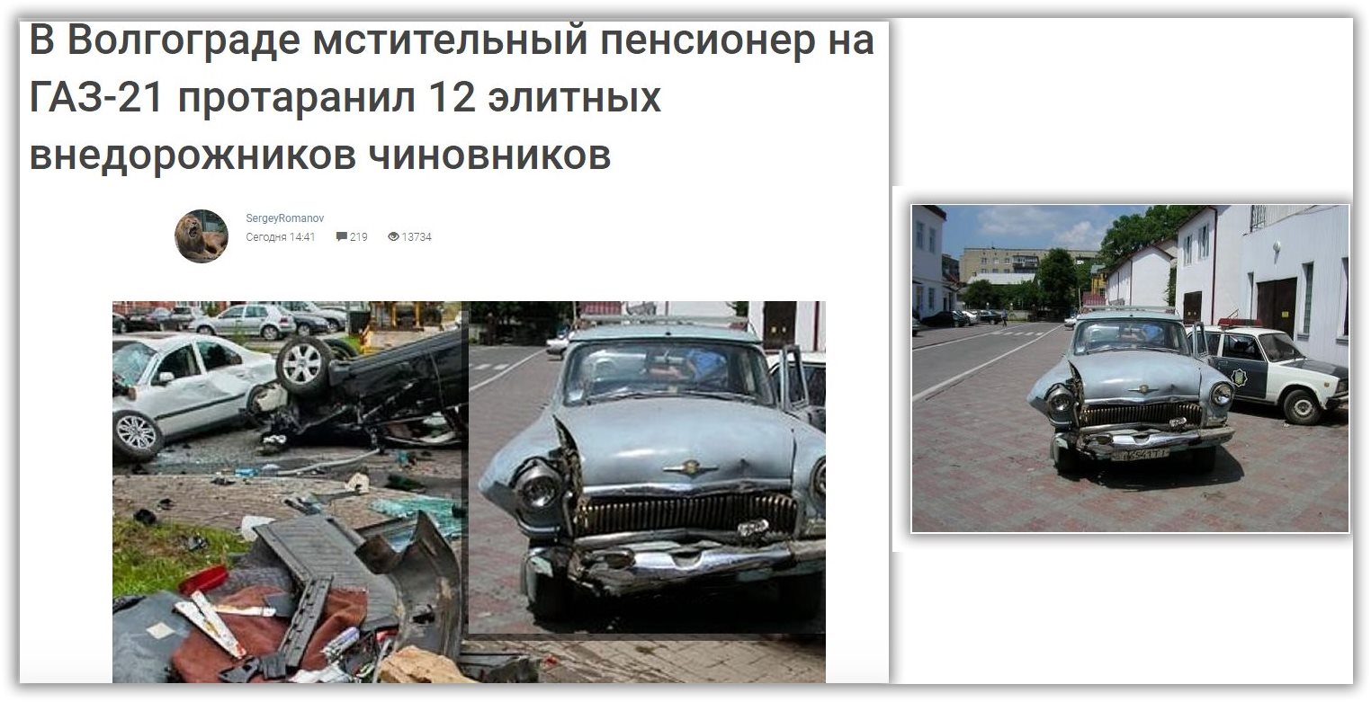 QUOTE(Soltek @ Apr 14 2019, 22:28) Как хотелось в это верить. Но увы. Кадры постановочные. И как назло ни одного видео. А уж мы то знаем - если какая заварушка, то в сети обычно развитие ситуации заснято с разных сторон. В этом же случае на картинке разбитые машины и сбоку сиротливо виновница торжества. А на поверку Волга с Украины. Вернее фото оттуда... Дык ясно сразу было что это фейк-------------------- Да уж...