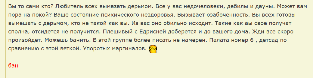 QUOTE(Mart @ May 8 2019, 19:44) Вы плохо учились в школе. У вас какое образование, интересно? 8 классов? Больше? Ах да, по выделенному: самое страшное для селянина, это когда в курятнике заведется ласка. Она убивает всех кур. Просто нравится убивать. Волки вырезают все стадо - просто ради развлечения. Синица, "Большая синица" - одно из жесточайших существ в мире. Если оказывается в клетке с другими птицами ее размера - всех убивает. Продолжать не буду. Я не смогу восполнить пробел в вашем развитии, дать то, что не дала вам школа. Это очень большой объем. Однажды в трехсуточном путешествии я оказался в одной машине с таким, как вы. он три дня при первой возможности рассказывал о том, как жиды-рептилоиды захватили мир, о мировых заговорах, и о всяком таком. Это было ужасно. К концу путешествия я был готов его убить. Самое интересное, что "жидоненавистник" был по внешности настоящим "еврейским гусаром" - невысокий. смуглый, курчавый и большеносый. Врач-анестезиолог. Вы то сами кто? Любитель всех вымазать дерьмом. Все у вас недочеловеки, дебилы и дауны. Может вам пора на покой? Ваше состояние психического нездоровья. Вызывает озабоченность. Вы всех готовы вымешать с дерьмом, кто не такой как вы. Из вас оно обильно исходит. Такие как аы свое получат сполна, отсидется не получится. Плешивый с Едрисней доберется и до вашего дома. Жди все скоро произойдет. Можешь банить. В этой группе более писать не намерен. Палата номер 6 , детсад по сравнению с этой веткой. Упоротых маргиналов. бан -------------------- Nec sutor ultra crepidam