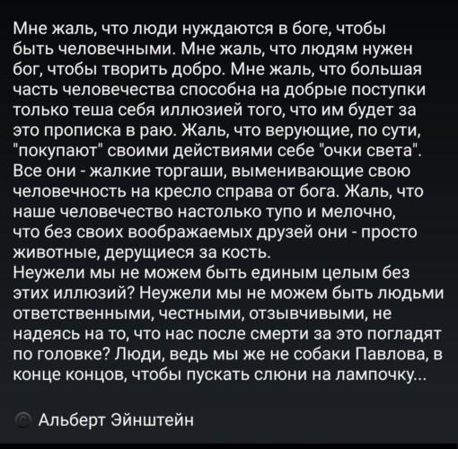 QUOTE(Voshod @ Nov 30 2019, 15:31) Чувства есть. Но не религиозные. Он атеист. Там другие статьи. А в пропасть, не в пропасть.. Тут как посмотреть. Да и насильно то ведь не заставляют, да и бессмысленно это. А современная Церковь (точнее некоторые её представители) - да, только дискредитируют. Но это видно и во всем остальном. Начиная от руководителя и заканчивая малым звеном. Сейчас во многом все с ног наголову поставлено. Время такое. А кто такие верующие? Покажите мне их! "Если вы будете иметь веру с горчичное зерно и скажете горе сей: «перейди отсюда туда» и она перейдет" Так что оскорблять то, как бы и не кого. PS У меня "антивирус" на картинки amaminа постоянно ругается! Когда их открываю. Кто кого оскорбляет? Картинки антивируса или антивирус картинки? Кстати. А как у других? Сообщение отредактировано Наполеон IV: Nov 30 2019, 15:42 -------------------- "Мы слишком подлые, чтобы умереть! Сорняки не умирают!" Вольф Хоффман