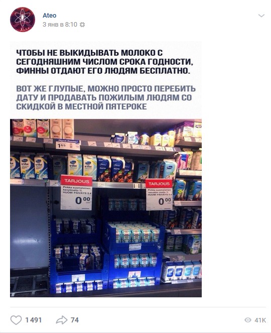 QUOTE(stiks @ Nov 30 2019, 18:49) Чтобы не выкидывать молоко с сегодняшним числом срока годности,Финны отдают его людям бесплатно. Ха. У нас ФНС быстренько таким штрафом наградит, штаны спадут. |