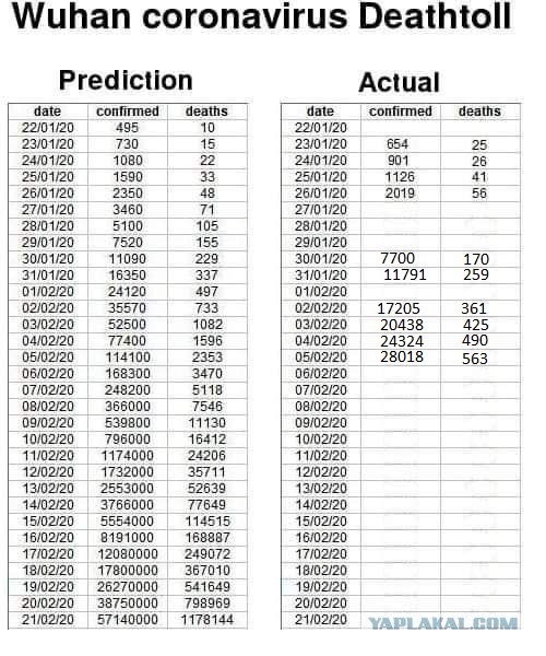 QUOTE(sitr @ Feb 6 2020, 07:00) Обновленная информация о вспышке пневмонии, вызванной новой коронавирусной инфекцией, по состоянию на 24 часа Опубликовано: 2020-02-06 источник: управление по чрезвычайным ситуациям в области здравоохранения В период с 0 по 24 часа 31 провинция (автономные районы, муниципалитеты) и Синьцзянский производственный корпус сообщили о 3694 новых подтвержденных случаях заболевания (2987 случаев в Хубэй), 261 новый случай излечения (113 случаев в Хубэй) и 21365 человек, имевших тесные контакты с пациентами, которые были освобождены от медицинского наблюдения в тот же день.Было зарегистрировано 640 новых случаев тяжелой болезни (564 случая в Хубэй), 73 новых случая смерти (70 случаев в провинции Хубэй, 1 случай в Тяньцзине, 1 случай в Хэйлунцзяне и 1 случай в Гуйчжоу) и 5328 новых предполагаемых случаев заболевания (3230 случаев в Хубэй). По состоянию на 24 часа 31 провинция (автономные районы, муниципалитеты) и Синьцзянский производственно-строительный корпус сообщили о 28018 подтвержденных случаях заболевания, 1153 из которых были вылечены и выписаны из больницы, 26302 случая изолированы (из них 3859 случаев тяжелой болезни), 563 случая со смертельным исходом и 24 702 предполагаемых случая заболевания.Всего было прослежено 282813 лиц, имевших тесные контакты с пациентами, и 186354 человека, которые до сих пор находятся под медицинским наблюдением. В общей сложности было получено 42 подтвержденных случая заболевания в районе Гонконга, Макао и Тайваня: 21 случай заболевания в САР Гонконга (1 случай со смертельным исходом), 10 случаев заболевания в САР Макао и 11 случаев заболевания на Тайване. (Примечание: при цитировании в средствах массовой информации, пожалуйста, отметьте "информация с официального сайта Национального совета по здравоохранению".) На основе данных которые Вы выкладываете, заполняю таблицу(кто то здесь же выкладывал). В таблице все очень наглядно. Вложенные эскизы изображений |