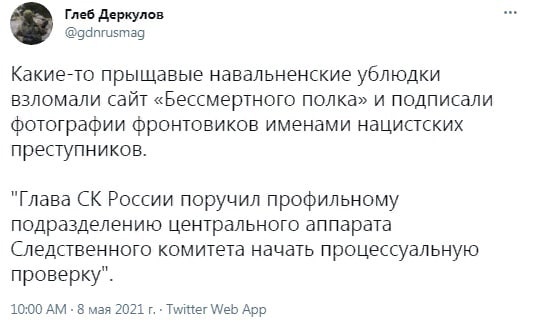 QUOTE(Neolit @ May 9 2021, 22:19) Хватит ли умишки? Ну вы всех сторонников Навального в дебилы не записывайте, тем более что продвинутых айтишников и прочих программистов среди креативных протестунов хватает.QUOTE(Neolit @ May 9 2021, 22:19) Это тоже навальнисты сделали? - Не знаю, вполне может и просто раздолбаи, может дураки, а может и провокаторы.«Во Владивостоке заменили флаги к 9 Мая, похожие на символику ВМС Японии» QUOTE(jagd @ May 9 2021, 22:25) а свои мысли есть а не только попугая включать? Вот умная и зрелая мысль, начали уже отмечать наверное?Сообщение отредактировано liperator: May 9 2021, 22:43 -------------------- Что ты знаешь о солнце, если в шахте ты не был.