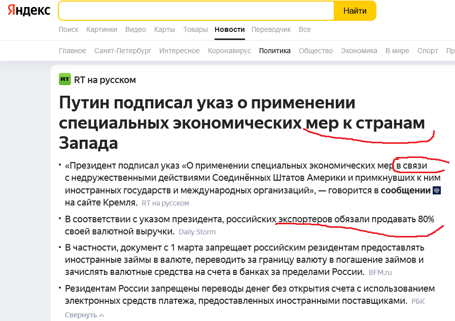 Заголовок: Приняли меры к странам запада... Новость № 1 - Указ в связи с недружественными действиями стран.... Новость № 2 - Обязанность переводить поступление валюты в рубли, чтоб не было ее много... Вот так и надо все воспринимать что говорят по телевизору Вложенные эскизы изображений |