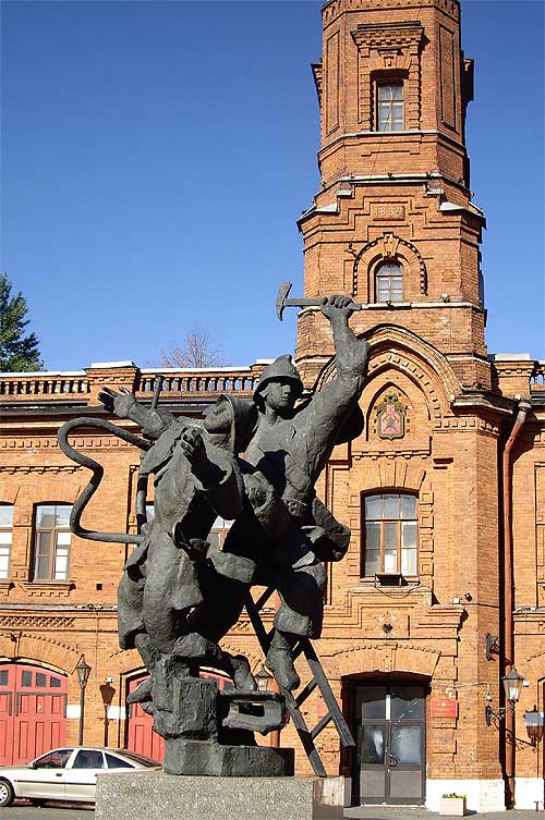 Сейчас в ней находится музей пожарной охраны. Посвящена скульптура брандмейстерам, погибшим во время Великой Отечественной войны в Ленинграде во время тушения пожаров, вызванных бомбежками и артиллерийскими обстрелами. Изначально, памятник был задуман как традиционная мемориальная галерея с портретами героев. Но в результате, скульптурная композиция превзошла все ожидания. Она изображает двух пожарных, борющихся с огнем. Вложенные эскизы изображений -------------------- Прав тот, у кого друг - директор.