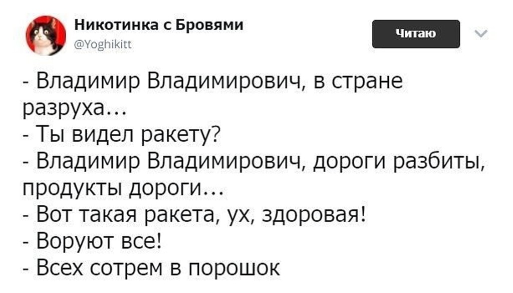 QUOTE(Mart @ Mar 4 2018, 14:19) Он не свежий, а давно протухший и вонючий. Больше не воняйте такими высерами. Рассержусь. Эт точно. Дороги исправно починяют. -------------------- То, что нас не убивает - делает нас сильнее.