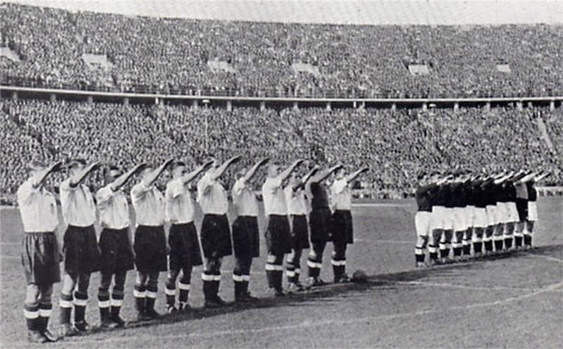 14 мая 1938 года в Берлине перед началом товарищеского матча с Германией футболисты сборной Англии приветствуют зрителей и официальных лиц нацистским жестом.