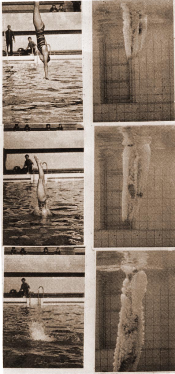 В 1980 г., перед Олимпиадой в Москве, в ЦАГИ обратился Спорткомитет СССР с просьбой исследовать гидродинамику входа в воду спортсменов при прыжках с трамплина с целью уменьшения брызг, поскольку «погашенный» вход в воду оценивается судьями максимально высоко. Поскольку в ЦАГИ были в этом деле профессиональные «корейцы» - то есть достаточно много собак съели на исследовании входа в воду всяческих «ништяков», кончая целыми самолетами, то исследовав «процесс», поняли, что главную роль там играет кавитация. Спортсмены складывали ладони лодочкой в форме конуса, и кавитатором служили их плечи. Было предложено создавать кавитатор специальным сложением кистей рук. Тогда получается каверна, охватывающая тело, обходя плечевой пояс и смыкающаяся за спортсменом – и всплеск почти исчезает… Наша команда на Олимпиаде в Москве взяла безоговорочное «золото»…