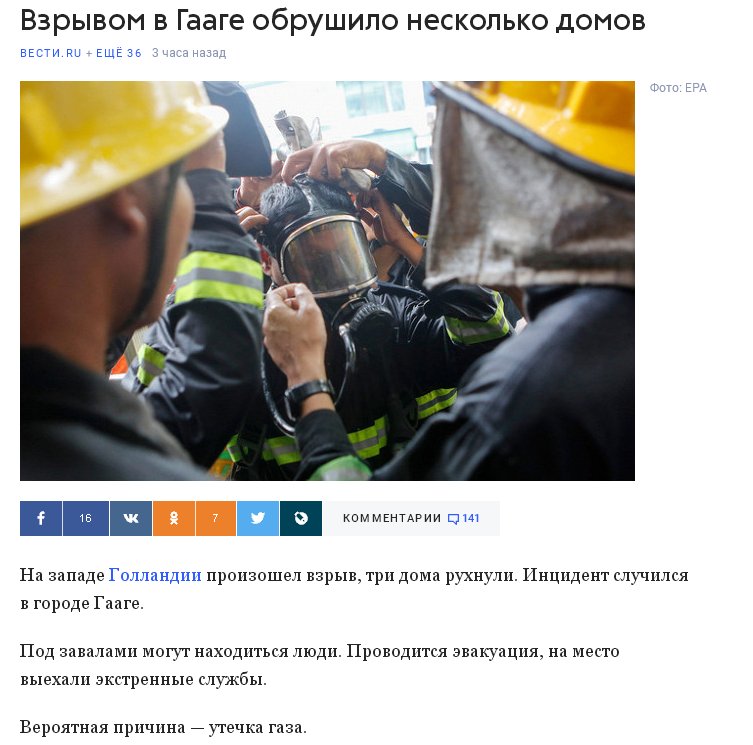 QUOTE(Руся @ Jan 27 2019, 20:05) Оказывается, газ взрывается не только у нас На западе Голландии произошел взрыв, три дома рухнули. Инцидент случился в городе Гааге. Под завалами могут находиться люди. Проводится эвакуация, на место выехали экстренные службы. Вероятная причина — утечка газа. Об этом сообщает Рамблер. Далее: https://news.rambler.ru/incidents/41627032/...source=copylink Не три дома, а взрыв газа в трёхэтажном доме... https://www.youtube.com/watch?time_continue=5&v=8YWblv3KZmw -------------------- Последний раз живём !