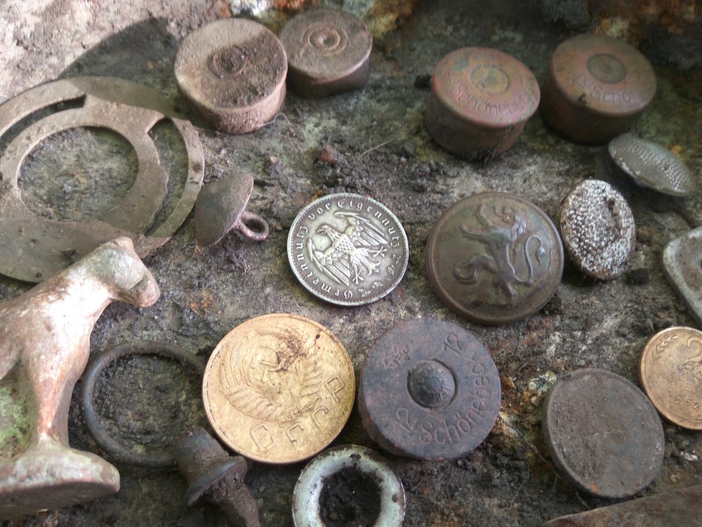 В режиме трех тонов, ходил по выбитому поселку, болотистая местность, грунт-чернозем с песком, ниже штыка лопаты вода. Всю мелочевку, что выкопал - капсуля охотничьи, пуговицы, монеты и пр., ниже штыка лопаты, каска с двух штыков. Разделение на высоте. Кучу цветмета на сдачу еще наковырял -проволоки медной и латунного лома. Алюминиевых крышек от итальянских котелков пару- в лесу оставил.