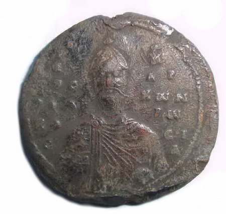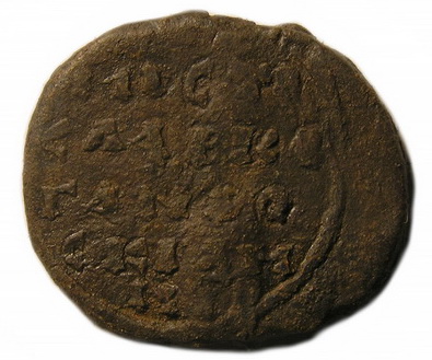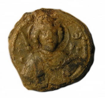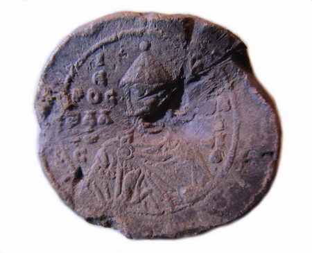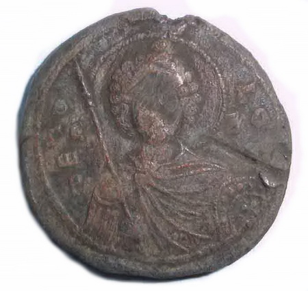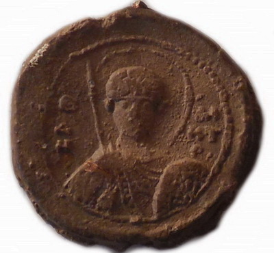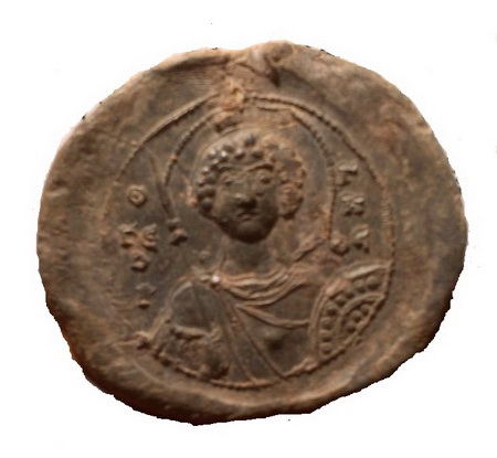 №4. Тип 3г. Л.с. Греческая благопожелательная надпись: +КЕRO-TWCWЛО-ГЕОРГА-РХ (Господи помози рабу своему Георгию Архонту). Вокруг точечный ободок. О.с. Погрудное изображение св. Георгия со щитом у левого плеча и с копьём у правого. Слева колончатая надпись: О-ГЕ-W-P, справа: ГI-O. Вокруг точечный ободок. Диаметр 38 мм. Место находки: Украина, 2014 г. Хранится в ч.к. (Жуков И.А., 2015. С. 277; 280, рис. 7).