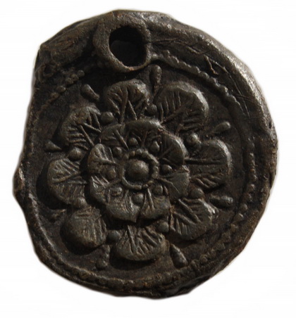 №17. Тип 3. Л.с. Восьмилепестковый цветок лотоса (лилии). Вокруг ободок сложной формы. О.с. Поясное изображение св. Дмитрия Солунского с копьём в правой руке и со щитом в левой. Слева колончатая надпись: О-А-ГI-О-С, справа: Д-IМН-ТРI. Вокруг точечный ободок. Диаметр 35 мм. Место находки: Киевская обл., 2011 г. Хранится в ч.к. (Жуков И.А., 2015. С. 121, тип 3).