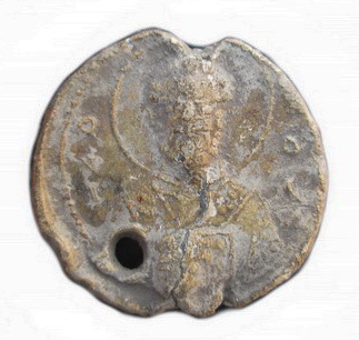 №18. Тип 4а. Л.с. Поясное изображение св. Дмитрия Солунского с копьём в правой руке и со щитом в левой. слева колончатая надпись: А-ГI-О-С, справа: Д-I-МН-ТРI. Вокруг точечный ободок. О.с. Поясное изображение Богоматери Оранты. По сторонам: МР - ОV (под титлами). Вокруг точечный ободок. Диаметр 31 мм. Место находки: Украина, 2013 г. Хранится в ч.к. (Жуков И.А., 2015. С. 122, тип 4а).