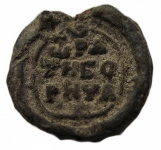 №102. Л.с. Греческая благопожелательная надпись в пять строк: +ΘКЕ–ROHOI–THCHД–ЕФIМН–А (Богородица помози рабе своей Ефимии). Вокруг точечный ободок. Оборотная сторона. Погрудное изображение св. Ефимии с крестом в правой руке и благословляющим жестом левой руки. Слева колончатая надпись: Н–А–ГI–A, справа: Е–ФI–MI–A. Вокруг точечный ободок. Диаметр 28 мм. Место находки: Киевская обл., Бородянский р-н 2009 г. Хранится в ч.к. (Жуков И.А., 2017. Свод. С. 102). Сообщение отредактировано Сфраги: Feb 16 2018, 13:43 Вложенные эскизы изображений -------------------- Куплю вислые печати К.Р.