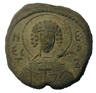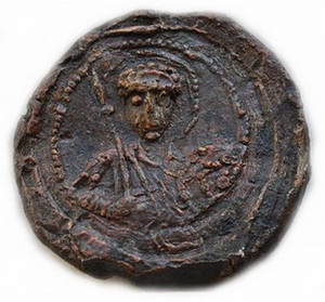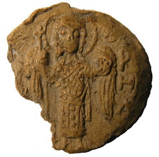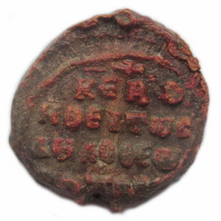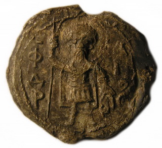 №133. Л.с. Греческая надпись в пять строк: ПРWТО–ПРОЕДРОN–EV:С.ТАΘI–ONМЕСКЕ–ПЕ (Воззри на меня протопроедра Евстафия). Вверху крест между двумя линиями. Вокруг точечный ободок. О.с. Изображение св. Феодора в полный рост, с копьём в правой руке и со щитом в левой. Слева колончатая надпись: О–А–ГI–O–C–Θ–Е, справа: О–ДW–Р–О–С. Вокруг точечный ободок. Диаметр: 21-23 мм. Место находки: Новгородская обл., 2012 г. Хранится в ч.к. (Жуков И.А., 2018. РЛО. Т. 5. Свод. С. 20. Первая пара матриц). Комментарий: В.Л. Янин и П.Г. Гайдуков относят эту буллу первому боярскому посаднику Новгорода Завиду, получившему эту должность в малолетство князя Мстислава около 1088 г. (Янин В.Л., Гайдуков П.Г., 1998. Т. 3. С. 39, № 72, 73). Сообщение отредактировано Сфраги: May 4 2018, 10:32 Вложенные эскизы изображений -------------------- Куплю вислые печати К.Р.