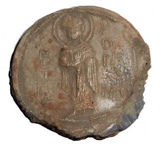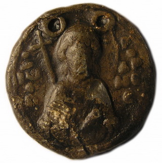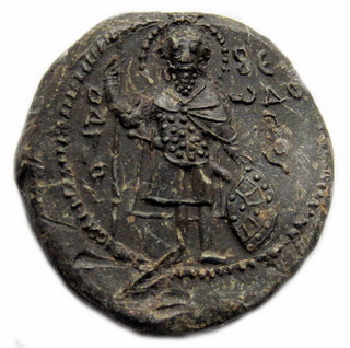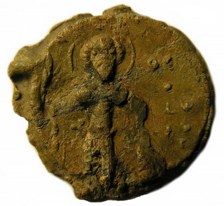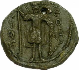 №131. Тип 5а. Л.с. Ростовое изображение св. Феодора, с копьём в правой руке и со щитом в левой. Слева колончатая надпись: О–А–ГI–О–С, справа: ΘЕ–О–ДW–РО–С. Вокруг ободок. О.с. Изображение «Сошествие во ад». Слева колончатая надпись: И–АИД. Вокруг ободок. Диаметр: 23 мм. Место находки: Житомирская обл., село Городище, 2007 г. Хранится в ч.к. (Жуков И.А., 2018. РЛО. Т. 5. Свод. С. 18-19. Тип 5а).