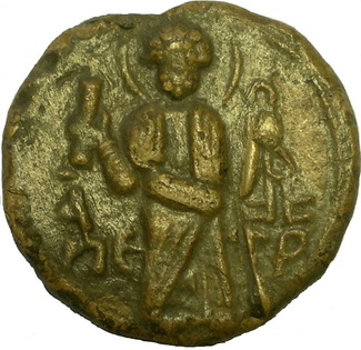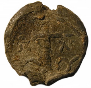 №123. Л.с. Надпись в две строки ДЬНЪ–СЛОВО. Вверху украшение в виде креста и двух точек. Внизу украшение из пяти точек. Вокруг точечный ободок. О.с. Ростовое изображение св. Петра. Слева колончатая надпись: А – ПЕ, справа: ТР. Вокруг точечный ободок. Диаметр – 23 мм. Место находки: Житомирская обл., Родомышлинский р-н, у села Борщев, 2014 г. Хранится в ч.к. (Жуков И.А., Жукова И.В., 2018. №11, рис 23). Не атрибутирована. Сообщение отредактировано Сфраги: Feb 12 2018, 20:17 Вложенные эскизы изображений -------------------- Куплю вислые печати К.Р.