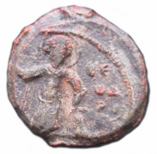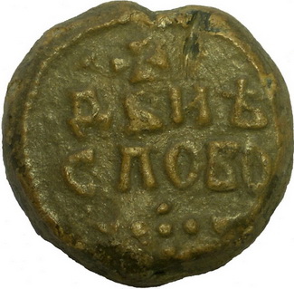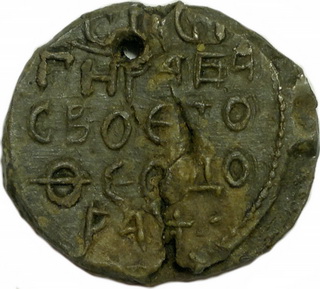 №127. Тип 2а-2. Л.с. Надпись в три строки: ДЬ–NЪСЛ–ОВО. Вокруг русская благопожелательная надпись, между точечным и линейным ободком, выполнена тонкими линиями: ГНПОМОЗН.. («Господи помози»,- надпись вошла частично, далее обрывки букв). О.c. Ростовое изображение св. Феодора, с копьём в правой руке и со щитом в левой. Слева колончатая надпись: Ф–Д–Р (под титлом), справа: А–ГI–О–С. Вокруг точечный ободок. Диаметр: 27-29 мм. Место находки: Украина, 2013 г. Хранится в ч.к. (Жуков И.А., 2018. РЛО Т. 5. Свод. С. 14-15. Тип 2а-2).
