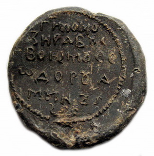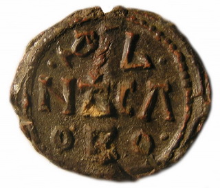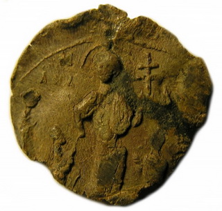 №128. Тип 2е. Л.с. Надпись в три строки: ДЬ–NЪСЛ–ОВО. Вокруг точечный ободок. О.с. Ростовое изображение св. Феодора, с копьём в правой руке и со щитом в левой. Слева колончатая надпись: Ф – Д, справа: Р (зеркально) – знак «агioc». Вокруг точечный ободок. Диаметр: 22 - 24 мм. Место находки: Украина, 2013 г. Хранится в ч.к. (Жуков И.А., 2018. РЛО. Т. 5. Свод. С. 16. Тип 2е).