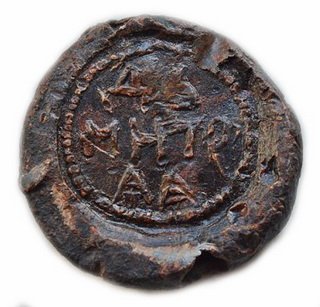№135. Тип 2. Л.с. Надпись в три строки: ДЬ-МНТР-ѦѦ. Вокруг точечный ободок. О.с. Погрудное изображение св. Дмитрия Солунского с копьём в правой руке и со щитом в левой. Вокруг точечный ободок. Диаметр 27 мм. Место находки: Черниговская обл., 2016 г. Не опубликована.
