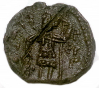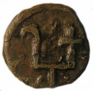 №170. Тип 4д. Л.с. Ростовое изображение св. Георгия, с копьём в правой руке и щитом в левой. Слева колончатая надпись: А–Г–I–О–С, справа: Г–Е–О–Р–(Г). Вокруг точечный ободок. О.с. Зеркальное изображение княжеского знака в виде двузубца прямолинейной формы. На левом отроге перекрестье, правый загнут наружу. У основания прямой отросток. Внутри знака точка и розетка из четырёх точек, слева и справа от знака и нижнего отростка по одной точки. Вокруг точечный ободок. Диаметр 18-21 мм. Место находки: Сумская обл., 2010 г. Хранится в ч.к. (Жуков И., 2016. С. 32. Тип 4д, рис. 12).