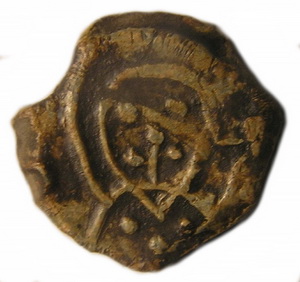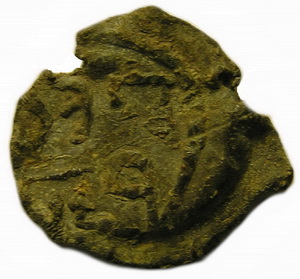 №163. Торговая пломба. Л.с. Погрудное изображение св. Кирилла. Вокруг ободок. О.с. Изображение княжеского знака в виде трезубца прямолинейной формы, с перекрестьем на левом отроге. Правый отрог загнут наружу. У основания прямой отросток. Вокруг ободок. Диаметр 9 – 12 мм. Место находки: Черниговская обл., 2011 г. Хранится в ч.к. (Жуков И., 2016. С. 36, рис. 12).