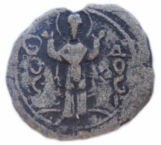 №185. Л.с. Ростовое изображение св. Феодосия Киновиарха, с развёрнутым свитком в левой руке. Слева колончатая надпись: (А–Г–Н–О–С), справа: Θ–Е–О–Д–(О–С). Вокруг линейный ободок. О.с. Ростовое изображение Богоматери Оранты, по сторонам: МР – ΘV(под титлами). Вокруг линейный ободок. Диаметр 19–22 мм. Место находки: Ровенская обл., 2009 г. Хранится в ч.к. (Жуков И., 2015. С. 42, рис. 10).