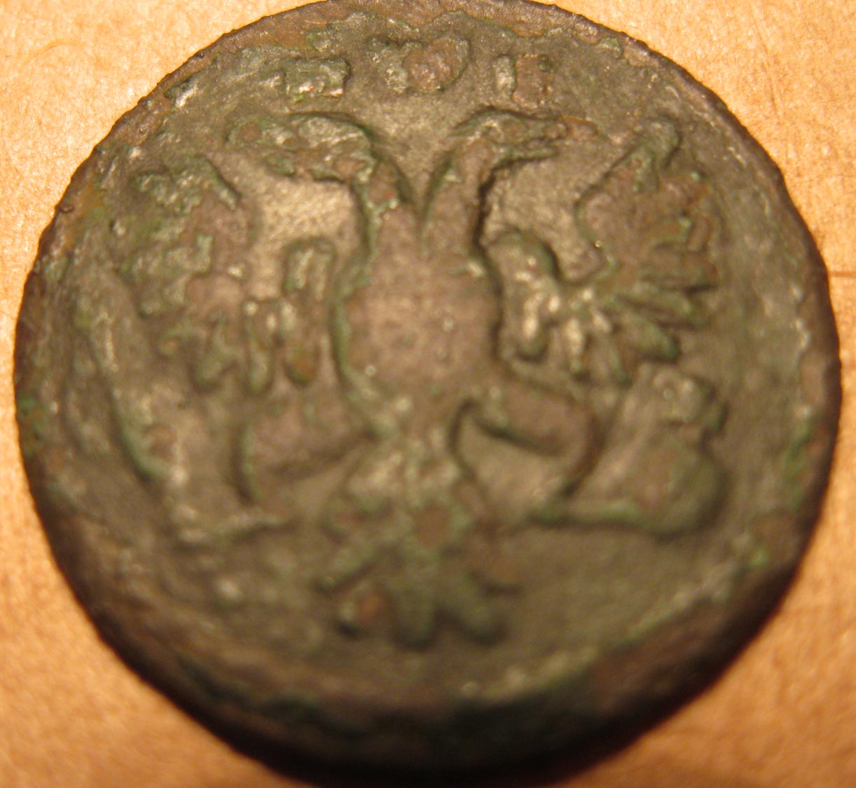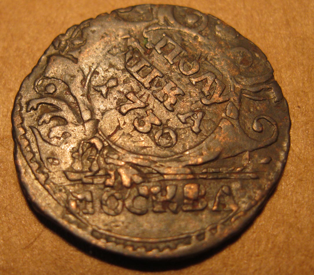 и ещё одна, рядовой в принципе перечекан, а вот копеечка крестовая с большими буквами МОСКВА, хоть и не самая редкая, но в-общем то чёткая.