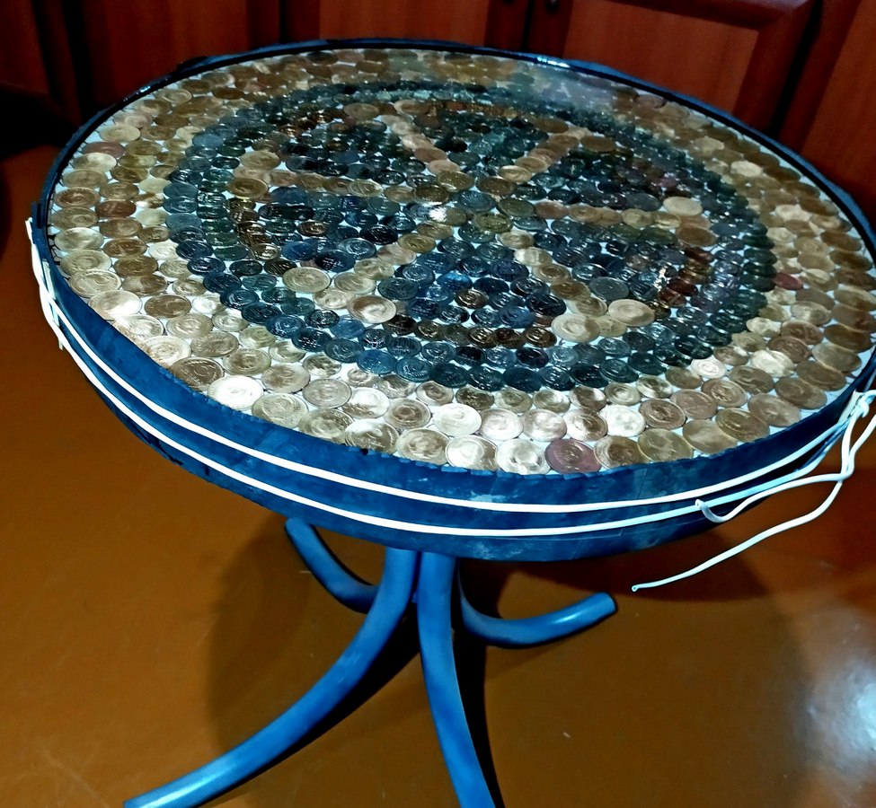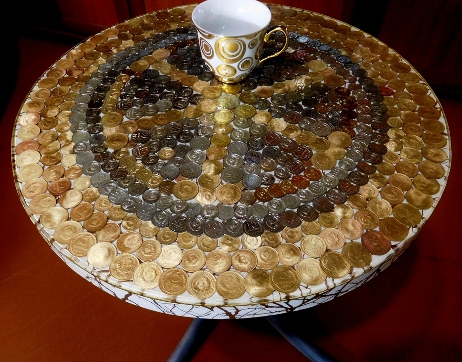 Вот мой вариант избавления от монет, заливка эпоксидной смолой на столик...