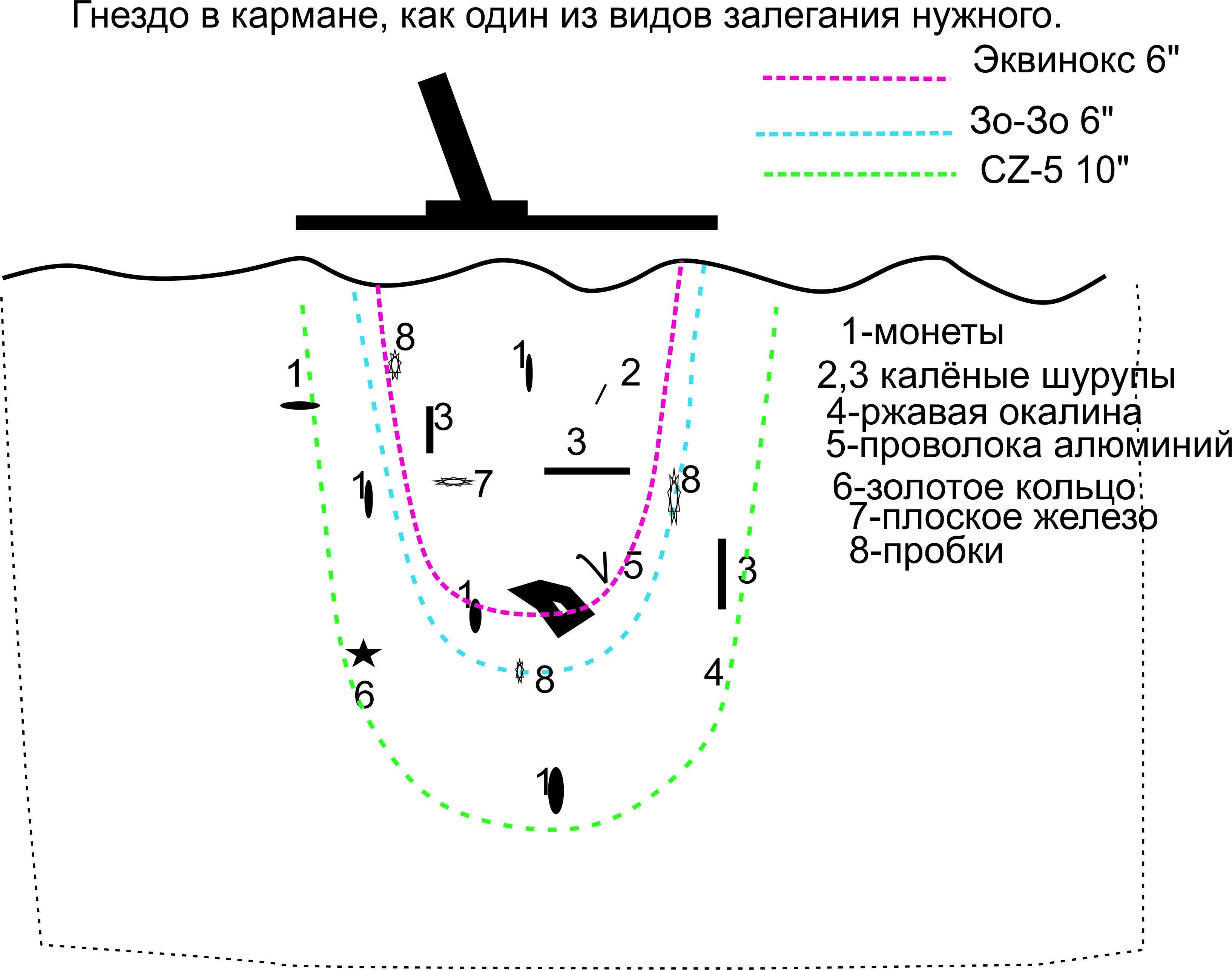 Да я ещё помню ту реакцию "Ячейки Святого Эква"на мой тест первого Эквинокса в море и поэтому намеренно отошёл от ярлыков типа: "Прибор говно". )))) Написав что именно в моих условиях. Но судя по тому что у нас на морской поиск, Эквиноксы привозят уже только новички- можно делать выводы. Люди с опытом вернулись каждый в своё "болото". Почему на загаженном пляже Эквинокс "Зло" Прикреплю схемку для пояснение своей мысли: