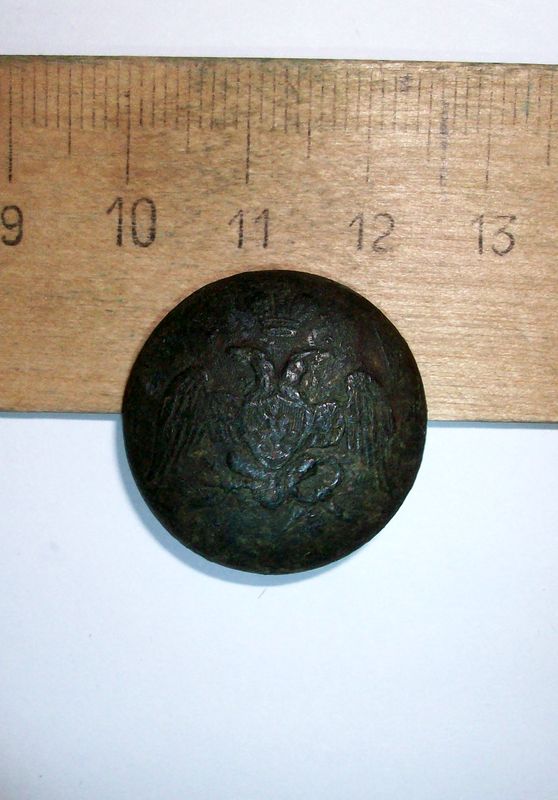 "в 1829 году пуговицы с орлами появляются в армии. Они присваиваются гвардейским частям. На пуговицах Гвардии чеканится орел с опущенными крыльями, со стрелами и венком в лапах, появившийся впервые на гвардейских киверах в 1808 году. Здесь нужно пояснить, что после своего прихода к власти Николай 1-й санкционировал одновременное употребление двух вариантов государственного герба. В первом (несколько упрощенном) орел изображался с расправленными («опущенными») крыльями под одной короной, помещенной над верхним выступом щита с изображением Св. Георгия Победоносца и без знаков ордена Св. Андрея Первозванного. При втором варианте орел имел три короны, чеканился с поднятыми крыльями, на которых помещались гербы шести главных «земель» Империи. Щит с Св. Георгием Победоносцем окружала цепь ордена Св. Андрея Первозванного. Специалисты по униформе и истории ведомственных мундиров высказывают предположение, что первый (упрощенный) вариант герба использовался в основном военными ведомствами, а второй - гражданскими." |