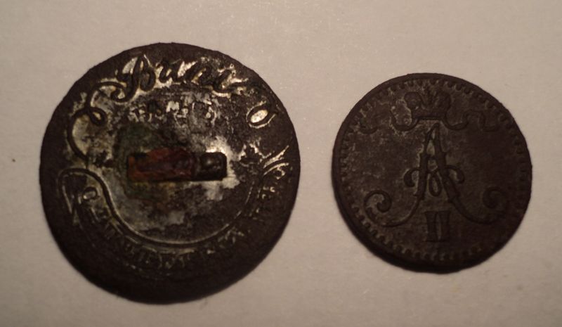 Пуговка да, считается пуговкой с охотничьего костюма. А найденная монетка, мне кажется, обрезанная по краю.
